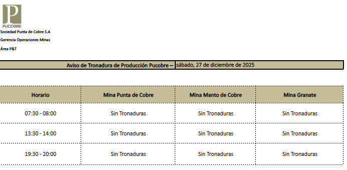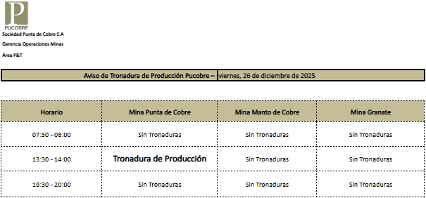 AVISO DE TRONADURAS DE PRODUCCIÓN PUCOBRE / VIERNES 26, SÁBADO 27 y DOMINGO 28 DE DICIEMBRE DE 2025