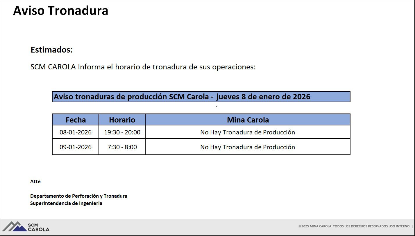 AVISO DE TRONADURAS DE PRODUCCIÓN SCM CAROLA / JUEVES 8 y VIERNES 9 DE ENERO DE 2026