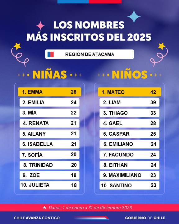 El Servicio de Registro Civil e Identificación Atacama dio a conocer los diez nombres más inscritos en la región durante el año 2025, siendo Emma el preferido para niñas, y Mateo entre niños.