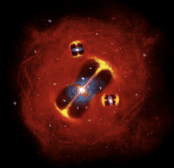 1. Impresión artística del cúmulo en formación SPT2349-56: chorros de radio procedentes de galaxias activas incrustadas en una atmósfera intracluster caliente (rojo), que ilustra un gran depósito térmico de gas en el cúmulo naciente. Crédito: Lingxiao Yuan.