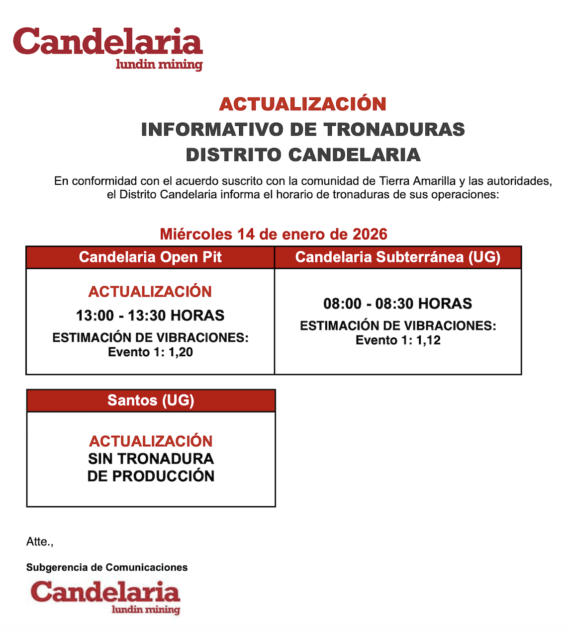 ACTUALIZACIÓN INFORMATIVO DE TRONADURAS CANDELARIA / MIÉRCOLES 14 DE ENERO DE 2026