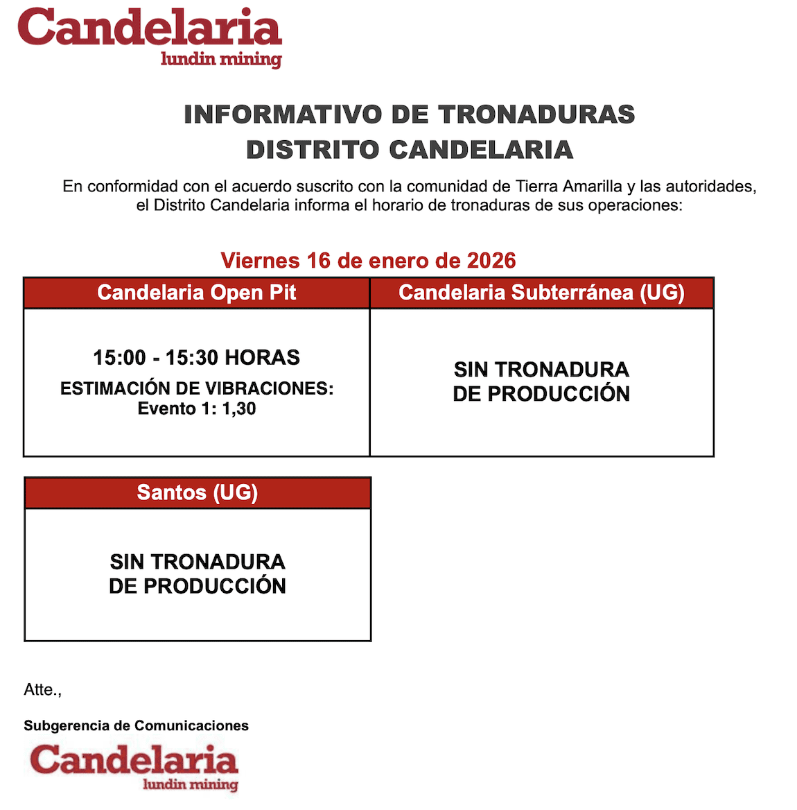 INFORMATIVO DE TRONADURAS DISTRITO CANDELARIA / VIERNES 16 DE ENERO DE 2026