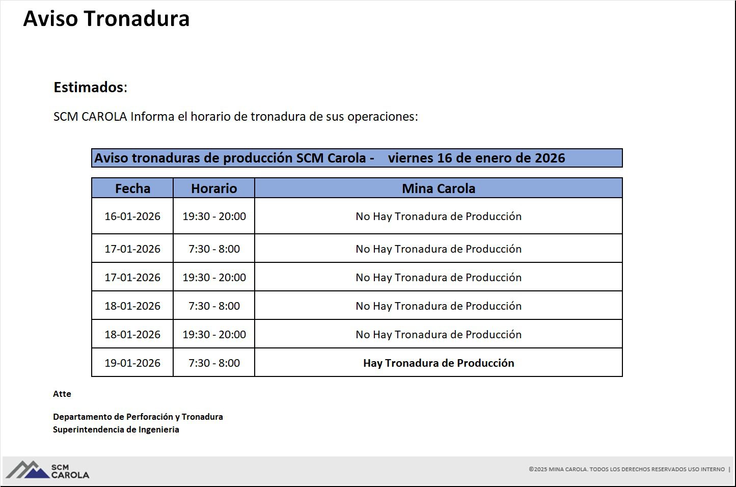 AVISO DE TRONADURAS DE PRODUCCIÓN SCM CAROLA / VIERNES 16, SÁBADO 17, DOMINGO 18 y LUNES 19 DE ENERO DE 2026