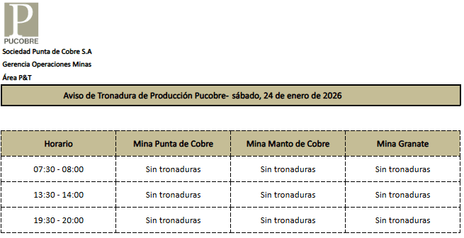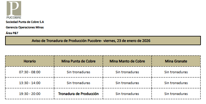 AVISO DE TRONADURAS DE PRODUCCIÓN PUCOBRE / VIERNES 23, SÁBADO 24 y DOMINGO 25 DE ENERO DE 2026