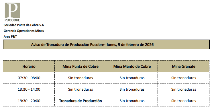 AVISO DE TRONADURAS DE PRODUCCIÓN PUCOBRE / LUNES 9 DE FEBRERO DE 2026