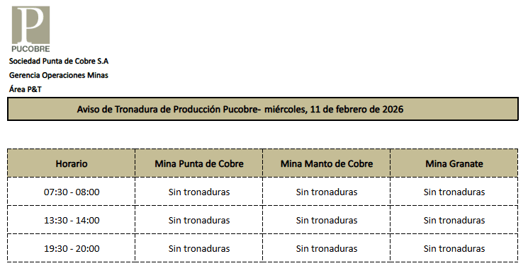 ACTUALIZACIÓN DE TRONADURAS DE PRODUCCIÓN PUCOBRE / MIÉRCOLES 11 DE FEBRERO DE 2026