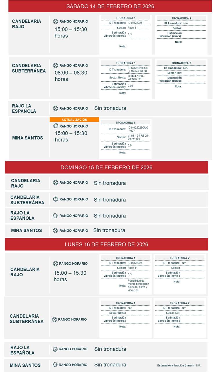 ACTUALIZACIÓN: INFORMATIVO DE TRONADURAS CANDELARIA / SÁBADO 14, DOMINGO 15 y LUNES 16 DE FEBRERO DE 2026