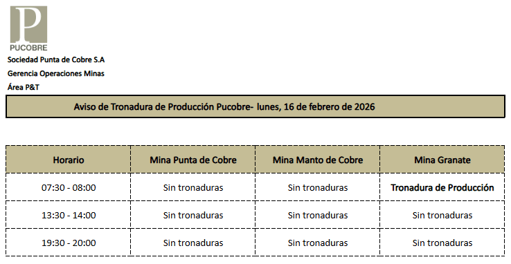 AVISO DE TRONADURAS DE PRODUCCIÓN PUCOBRE / LUNES 16 DE FEBRERO DE 2026