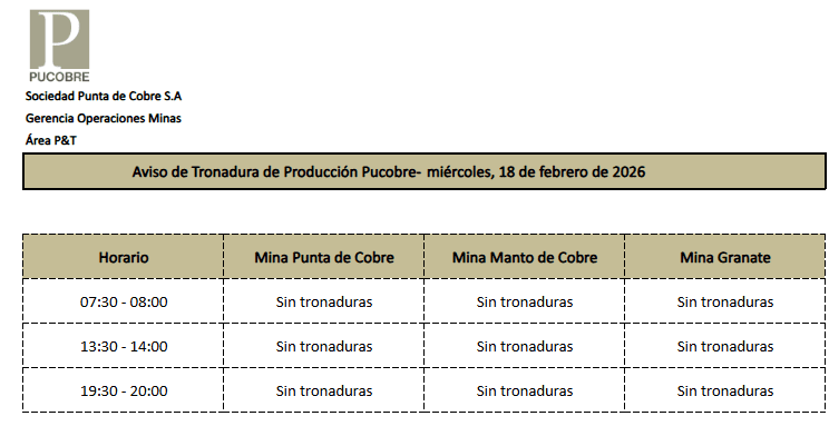 AVISO DE TRONADURAS DE PRODUCCIÓN PUCOBRE / MIÉRCOLES 18 DE FEBRERO DE 2026