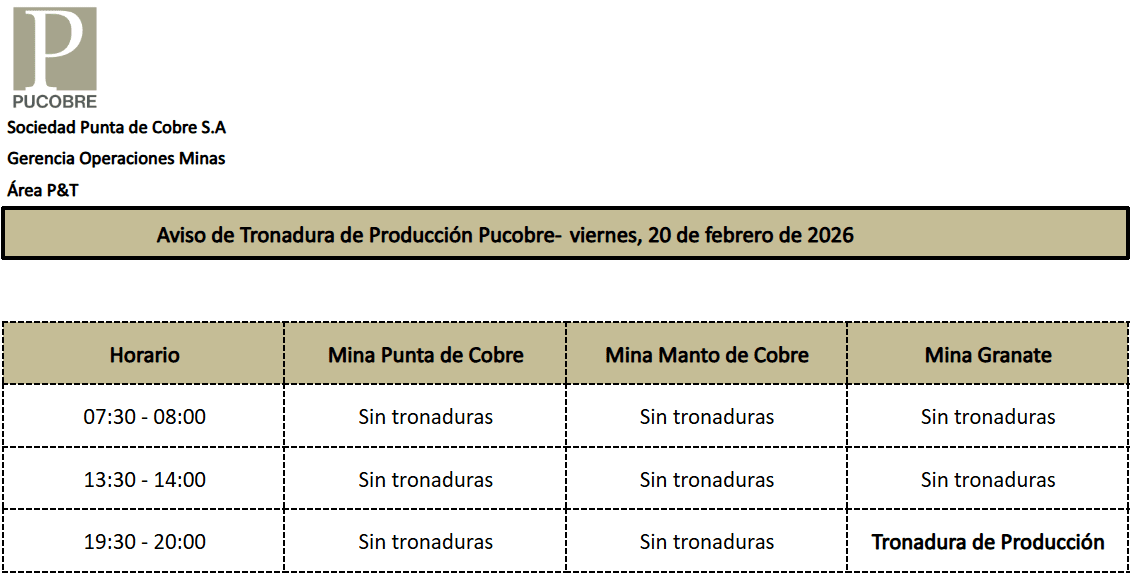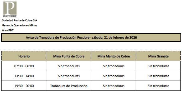 AVISO DE TRONADURAS DE PRODUCCIÓN PUCOBRE / VIERNES 20, SÁBADO 21 y DOMINGO 22 DE FEBRERO DE 2026