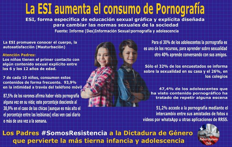 Hoy la actual administración del Gobierno de Chile, no quiere dejar el poder sin antes pagar su deuda con quienes son autores y promotores de la ESI y brindaron apoyo para llegar hasta La Moneda. Sus condiciones: erradicar el derecho preferente de los padres, entregar autonomía progresiva a los menores desde los catorce años, para no tener castigo alguno si un adulto accede carnalmente a un menor de edad, consentimiento informado porque si los niños desde su más tierna infancia conocen lo que los adultos pueden sentir por ellos y estos niños acceden al amor que el adulto le ofrece, “amor es amor” la acción es consentida, por lo tanto, no tiene condena legal ni social.