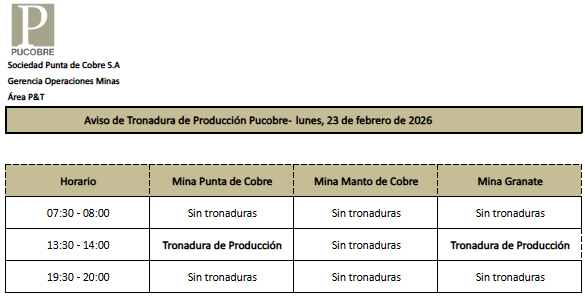 AVISO DE TRONADURAS DE PRODUCCIÓN PUCOBRE / LUNES 23 DE FEBRERO DE 2026