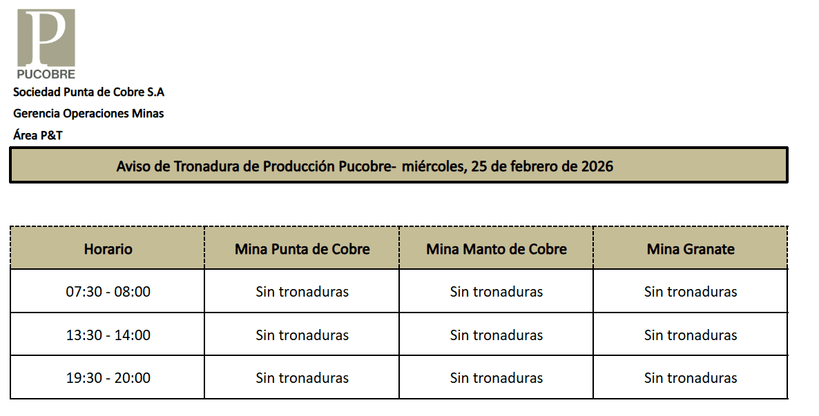 ACTUALIZACIÓN DE AVISO DE TRONADURAS DE PRODUCCIÓN PUCOBRE / MIÉRCOLES 25 DE FEBRERO DE 2026