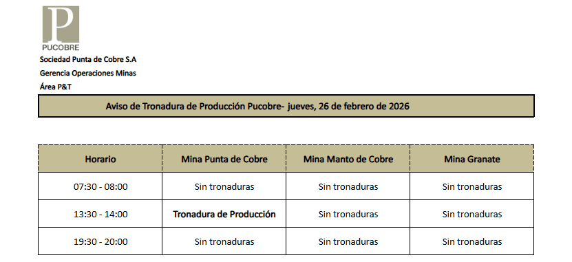 AVISO DE TRONADURAS DE PRODUCCIÓN PUCOBRE / JUEVES 26 DE FEBRERO DE 2026