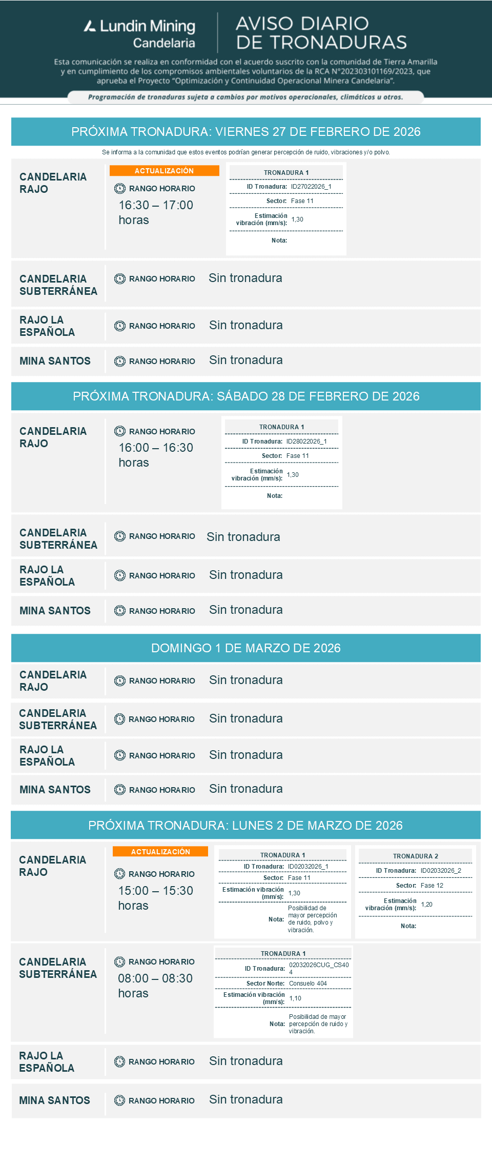 ACTUALIZACIÓN: INFORMATIVO DE TRONADURAS CANDELARIA / VIERNES 27 y SÁBADO 28 DE FEBRERO; DOMINGO 1 y LUNES 2 DE MARZO DE 2026