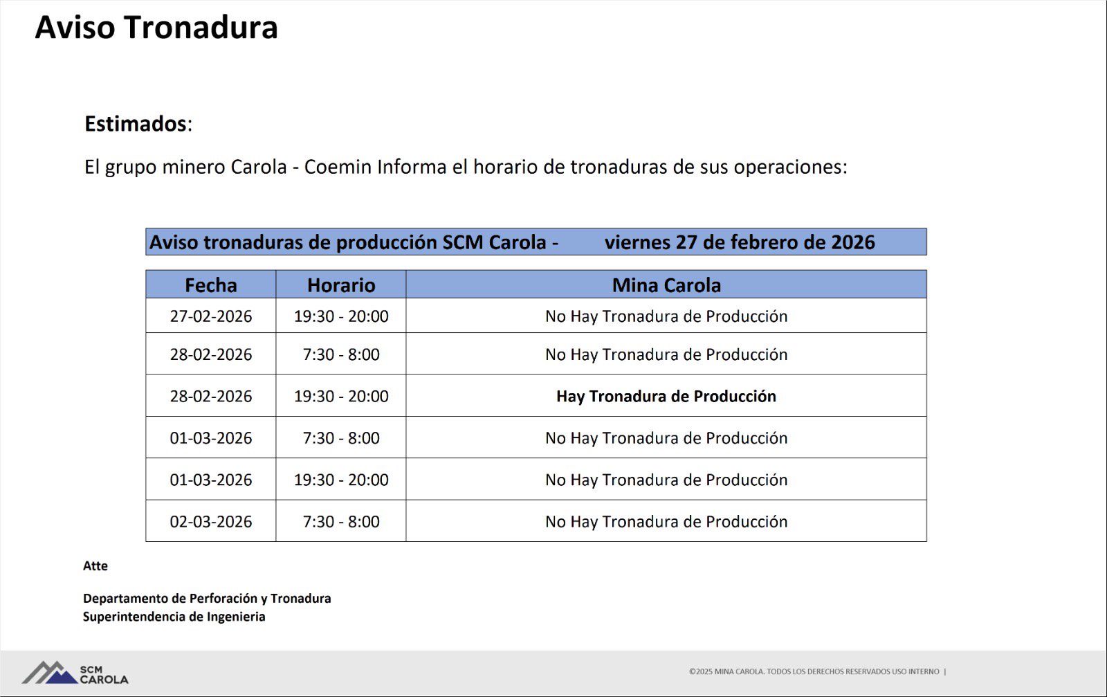 AVISO DE TRONADURAS DE PRODUCCIÓN SCM CAROLA / VIERNES 27 y SÁBADO 28 DE FEBRERO; DOMINGO 1 y LUNES 2 DE MARZO DE 2026