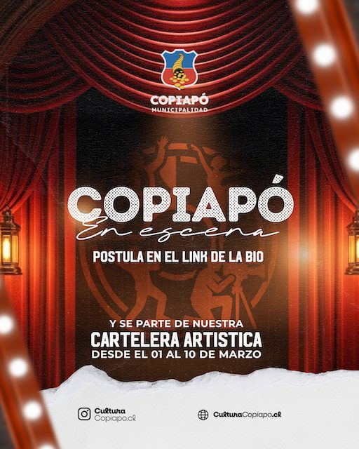 La Ilustre Municipalidad de Copiapó lanzó la convocatoria 2026 del programa «Copiapó en Escena», iniciativa que financiará un total de 56 presentaciones de distintas disciplinas artísticas en diversos puntos de la comuna. La convocatoria está dirigida a artistas y agrupaciones locales que cuenten con trabajos terminados, ya realizados y estrenados. Las postulaciones se recibirán a … Read more