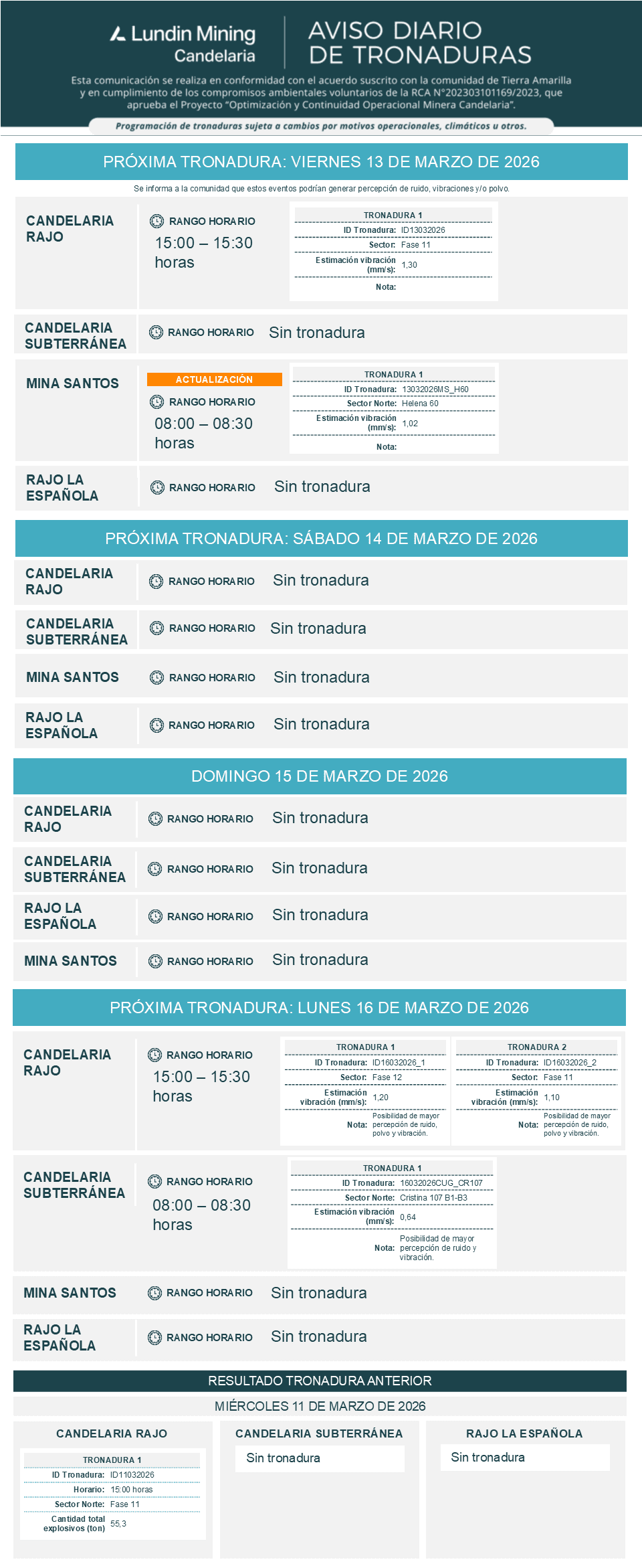 ACTUALIZACIÓN DE TRONADURAS CANDELARIA / VIERNES 13, SÁBADO 14, DOMINGO 15 y LUNES 16 DE MARZO DE 2026