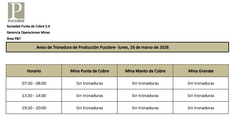 AVISO DE TRONADURAS DE PRODUCCIÓN PUCOBRE / LUNES 16 DE MARZO DE 2026