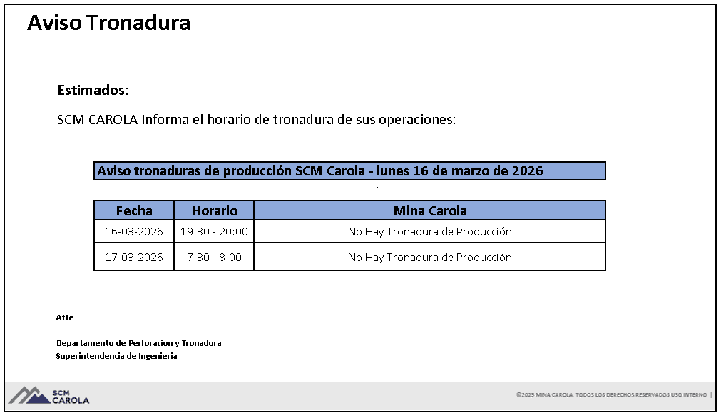 AVISO DE TRONADURAS DE PRODUCCIÓN SCM CAROLA / LUNES 16 DE MARZO DE 2026