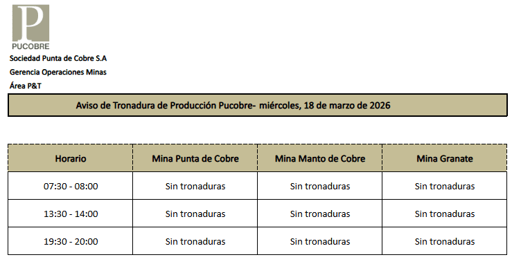 AVISO DE TRONADURAS DE PRODUCCIÓN PUCOBRE / MIÉRCOLES 18 DE MARZO DE 2026