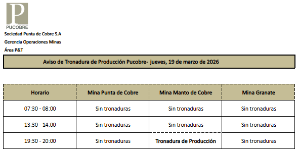 AVISO DE TRONADURAS DE PRODUCCIÓN PUCOBRE / JUEVES 19 DE MARZO DE 2026