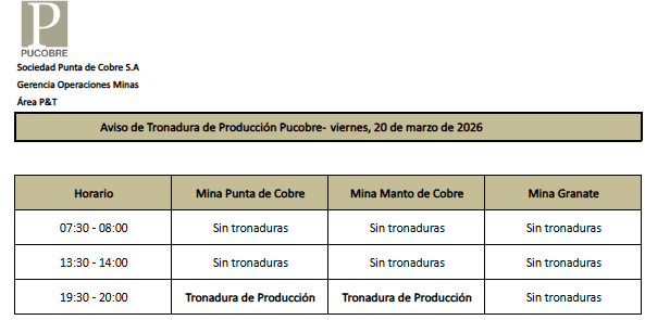 AVISO DE TRONADURAS DE PRODUCCIÓN PUCOBRE / VIERNES 20, SÁBADO 21 y DOMINGO 22 DE MARZO DE 2026
