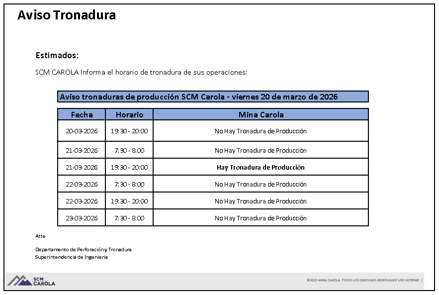 AVISO DE TRONADURAS DE PRODUCCIÓN SCM CAROLA / VIERNES 20, SÁBADO 21, DOMINGO 22 y LUNES 23 DE MARZO DE 2026