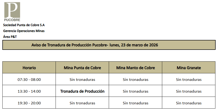 AVISO DE TRONADURAS DE PRODUCCIÓN PUCOBRE / LUNES 23 DE MARZO DE 2026