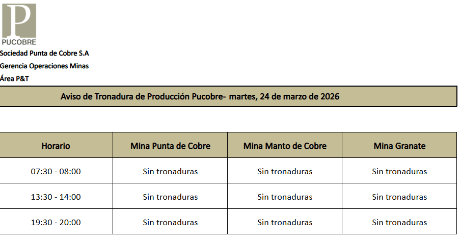 AVISO DE TRONADURAS DE PRODUCCIÓN PUCOBRE / MARTES 24 DE MARZO DE 2026