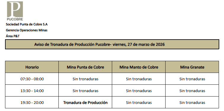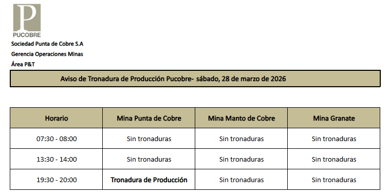 AVISO DE TRONADURAS DE PRODUCCIÓN PUCOBRE / VIERNES 27, SÁBADO 28 y DOMINGO 29 DE MARZO DE 2026