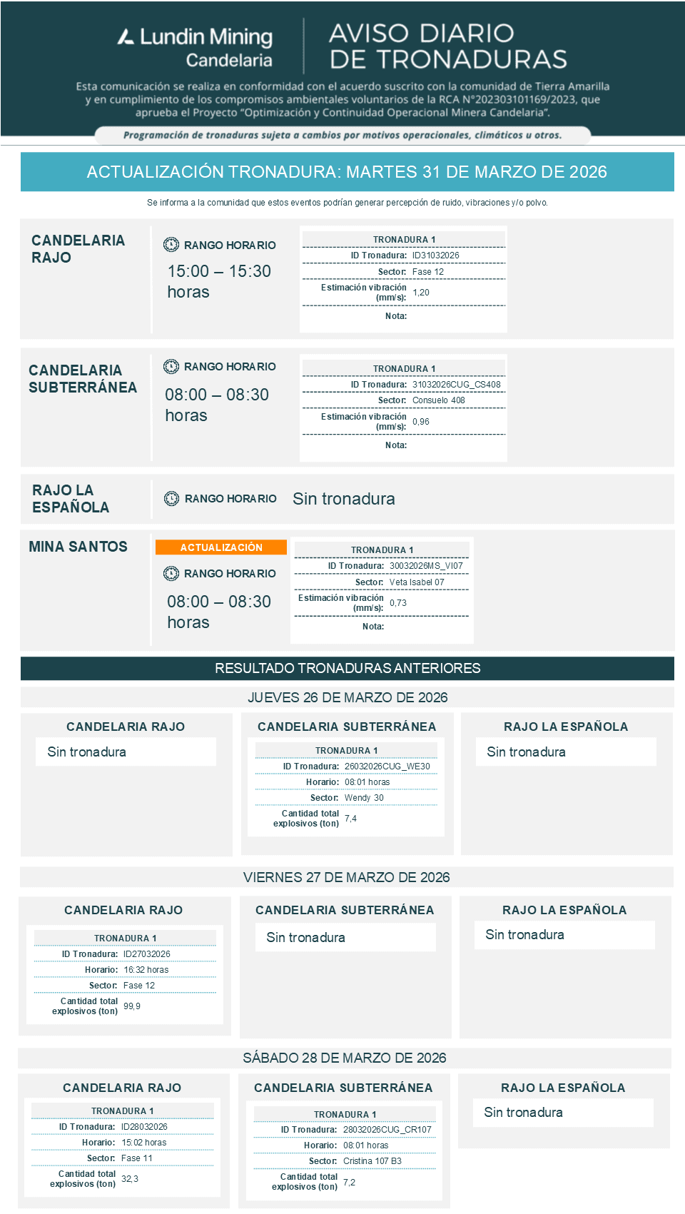 ACTUALIZACIÓN DE TRONADURAS DISTRITO CANDELARIA / MARTES 31 DE MARZO DE 2026