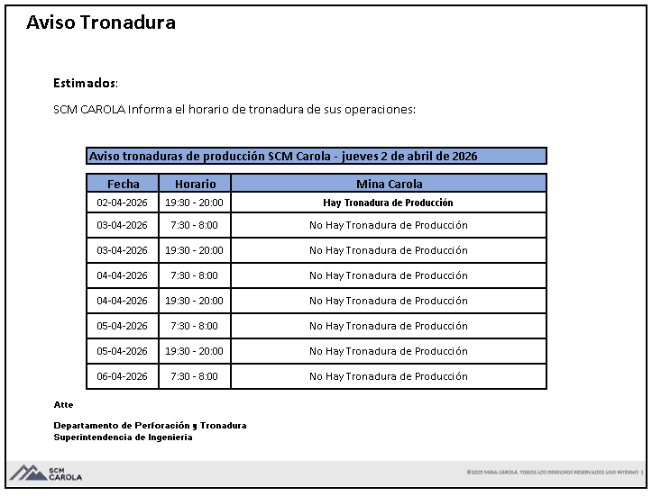 AVISO DE TRONADURAS DE PRODUCCIÓN SCM CAROLA / JUEVES 2, VIERNES 3, SÁBADO 4, DOMINGO 5 y LUNES 6 DE ABRIL DE 2026