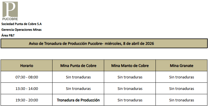 AVISO DE TRONADURAS DE PRODUCCIÓN PUCOBRE / MIÉRCOLES 8 DE ABRIL DE 2026