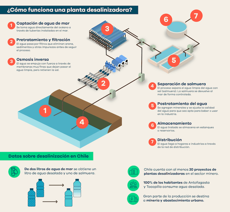 Cuando abrimos la llave de la ducha o del lavaplatos en nuestras casas, pocas veces nos preguntamos de dónde viene esa agua. En el norte de Chile, la respuesta a esa pregunta puede sorprender, porque en ciudades como Antofagasta ya viene directamente del mar. Y en las operaciones mineras, cada vez más también.