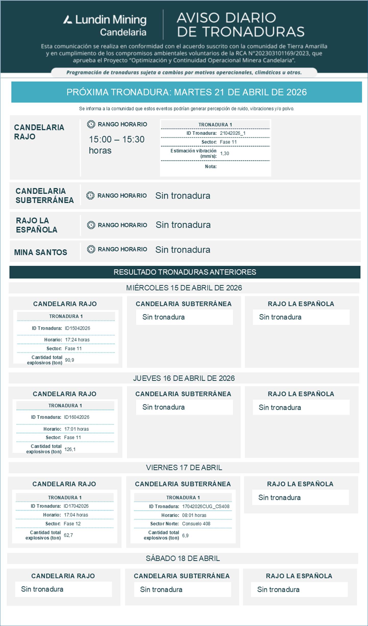 INFORMATIVO DE TRONADURAS DISTRITO CANDELARIA / MARTES 21 DE ABRIL DE 2026
