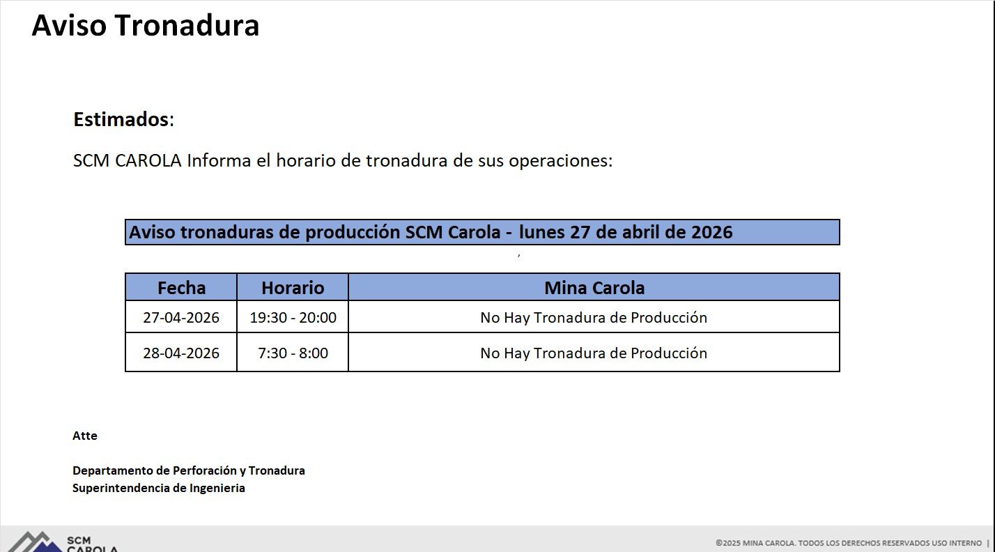 REPROGRAMACIÓN DE TRONADURAS DE PRODUCCIÓN SCM CAROLA / LUNES 27 y MARTES 28 DE ABRIL DE 2026