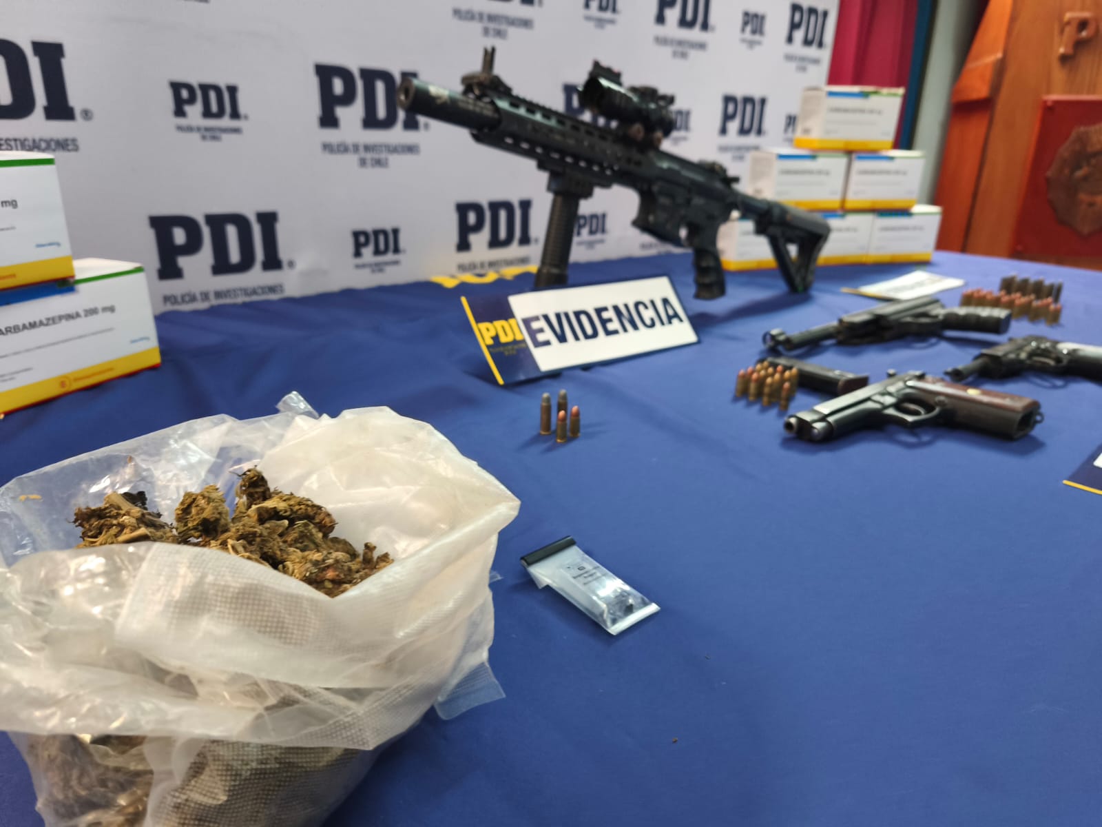 El oficial policial añadió que “en el marco de las diligencias investigativas se realizó una entrada y registro a un inmueble, lo que permitió incautar un arma de fuego tipo pistola, dos armas de fogueo, una réplica de fusil, 42 cartuchos de distinto calibre, más de 230 gramos de cannabis y 12 cajas de una sustancia utilizada para abultar droga”.